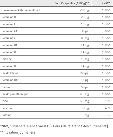 Mélange de vitamines (acide L-ascorbique, nicotinamide, DL-alpha-tocophéryl acétate, Dpantothénate de calcium, bêta-carotène, riboflavine, chlorhydrate de pyridoxine, mononitrate dethiamine, acide ptéroylmonoglutamique, D-biotine, phytoménadione, cholécalciférol, cyanocobalamine), antiagglomérants (cellulose microcristalline, dioxyde de silicium), hydroxypropylméthylcellulose, extraits de légumes et de fruits 13. 2%, (pépins de raisin, thé vert, raisin, tomates, carottes, myrtilles, brocoli, chou, oignons, ail, pamplemousse, asperges, papayes, ananas, fraise, pomme, abricot, cerises, oranges, cassis, olives, concombre), ester de lutéine, lactate de zinc, levure de sélénium.